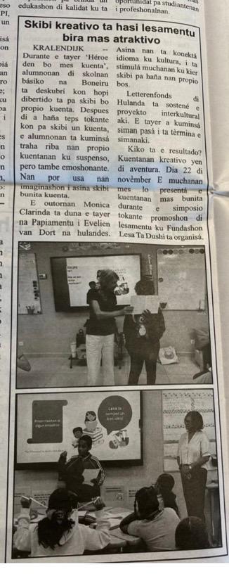 Schrijfworkshops je ‘eigen verhaal schrijven en presenteren’ voor de bovenbouw bibliotheek. op vijf basisscholen, de organisatie is in samenwerking met de Foundashion Lesa ta Dushi. De contacten met de scholen zijn van tevoren gemaakt. De leerlingen van de verschillende scholen hebben zich met enthousiasme ingezet. Leerkrachten en IB-ers zijn zeer betrokken om de insteek creatief schrijven meer toe te passen, ook om lezen te stimuleren.