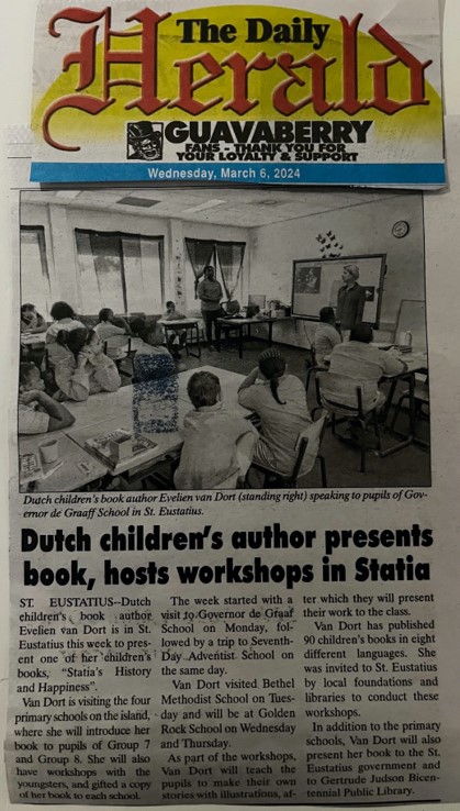 Met heel veel dank voor de ondersteuning van het Nederlands Letterenfonds, stichting Zonnige jeugd, Gebroeders Bakkkers Weeshuisfonds en Quota Int. Sint Eustatius die dit programma door stichting Munira aangeboden mede mogelijk gemaakt hebben. En alle dank aan mijn echtgenoot Henk, hij stond me dagelijks met raad en daad dagelijks bij, om deze programma’s vorm te geven die ik als kinderboekenauteur maar vooral ook als betrokken mens op vrijwillige basis verzorg. Evelien van Dort